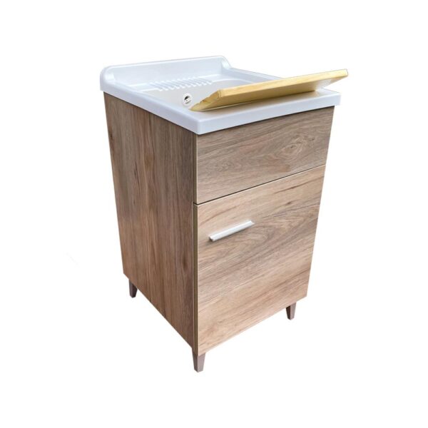 LAVATOIO SERENA 60X50 MOBILE LARICE ASSE LEGNO VERNICIATO FOGLIA ALLUMINIO SULLA BASE E VASCA RESINA CON SIFONE, PIEDINI E MANIGLIE